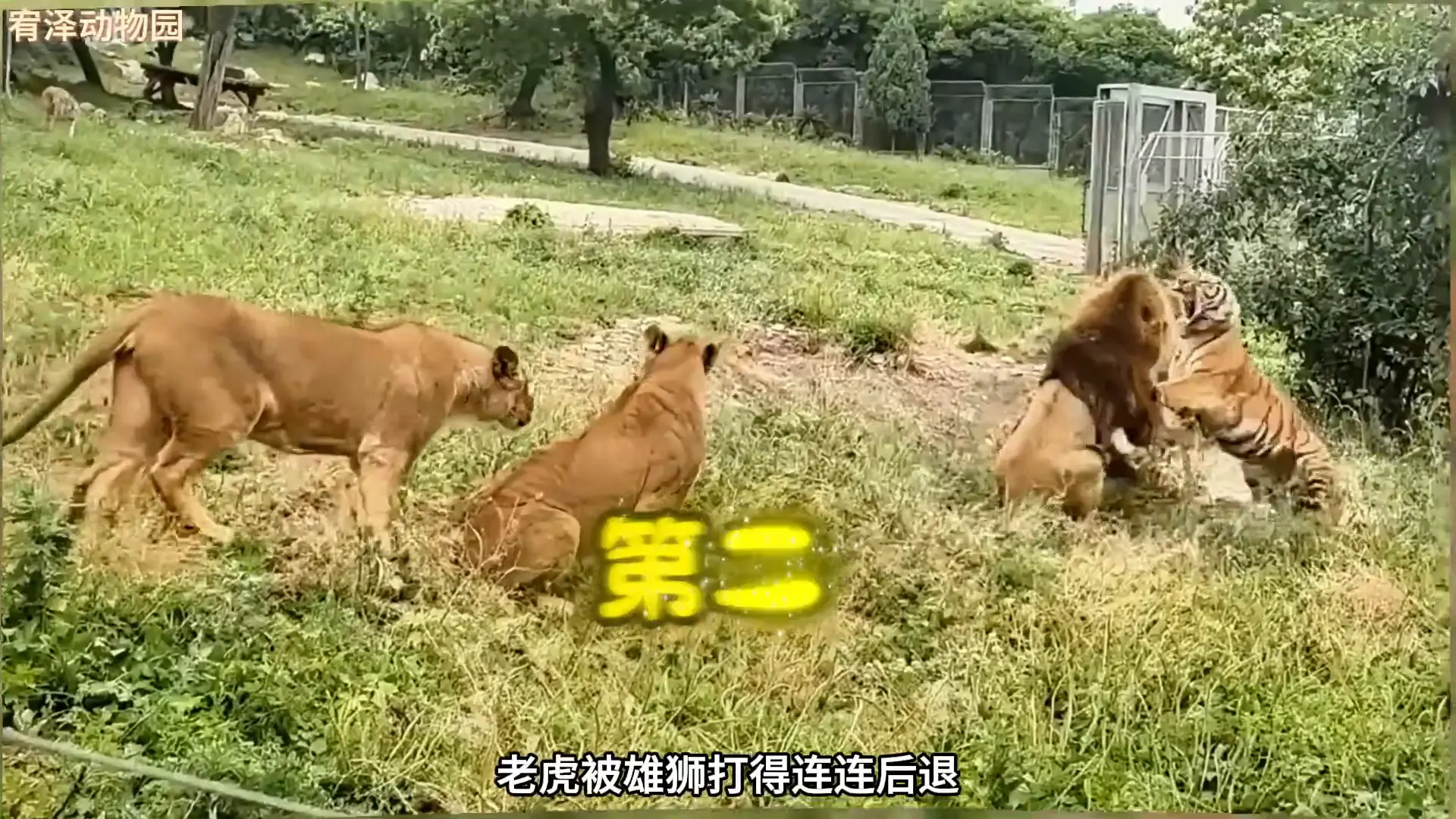 第一轮打斗结束后,双方基本战成平手,整体表现为狮子进攻,老虎防御为主。然而雄狮一直在吼叫示威,而老虎毫不畏惧地跟在雄狮身后也不示弱。动物园内狮子和老虎生活在一起,没有被刻意隔离开来。雄狮时不时会冲向老虎,但最终雄狮还是没有真正下死手,它只是显示自己的威严,警告老虎不要动歪心思。