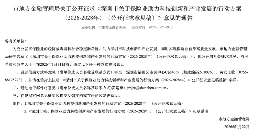 1月22日,深圳市地方金融管理局发布《深圳市关于保险业助力科技创新和产业发展的行动方案(2026—2028年)(征求意见稿)》(以下简称《行动方案》)华信投资,公开向社会征求意见。