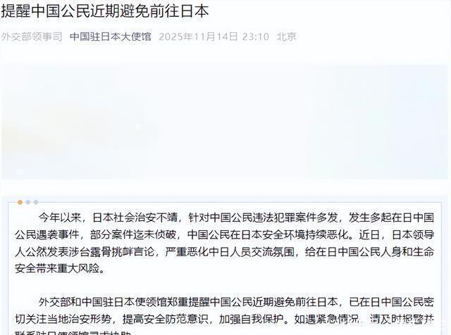 高市早苗是在11月13日,喊出了“台海局势可能触及本国存亡事态”这句话的。话音刚落,日本国内和来自中国的批评声音,就铺天盖地地席卷而来了。不仅是多位日本前首相批评她态度不对,就连日本的民间学者都说她应该“先道歉,再辞职”。 至于中国方面,谴责她的用词也很硬,比如说“侵略”“玩火者必自焚”等等。 同时,来自中国的“制裁”也来了。国家发布声明, 提醒中国人:最近别去日本 。与此同时, 很多中国的航空公司就开始削减去日本的航班