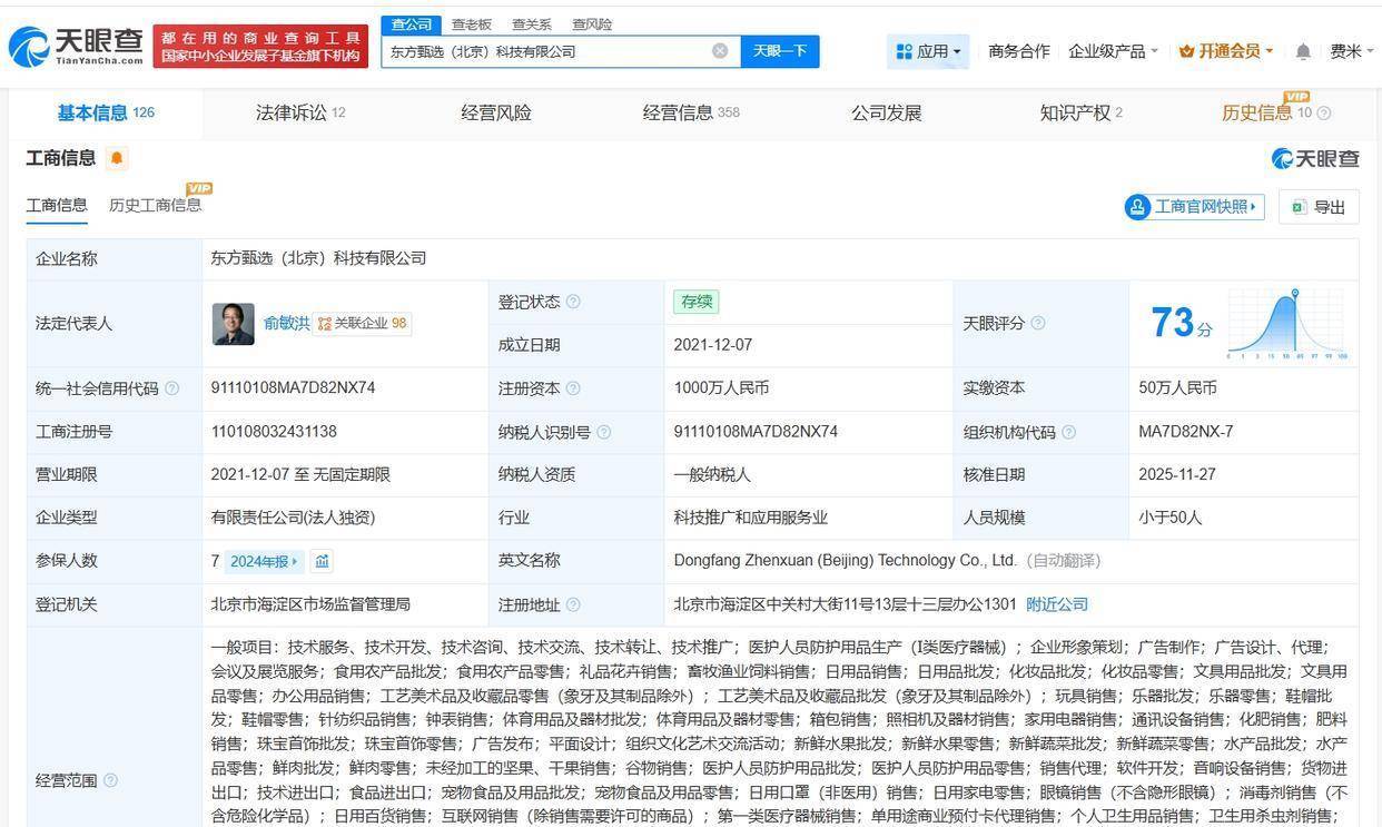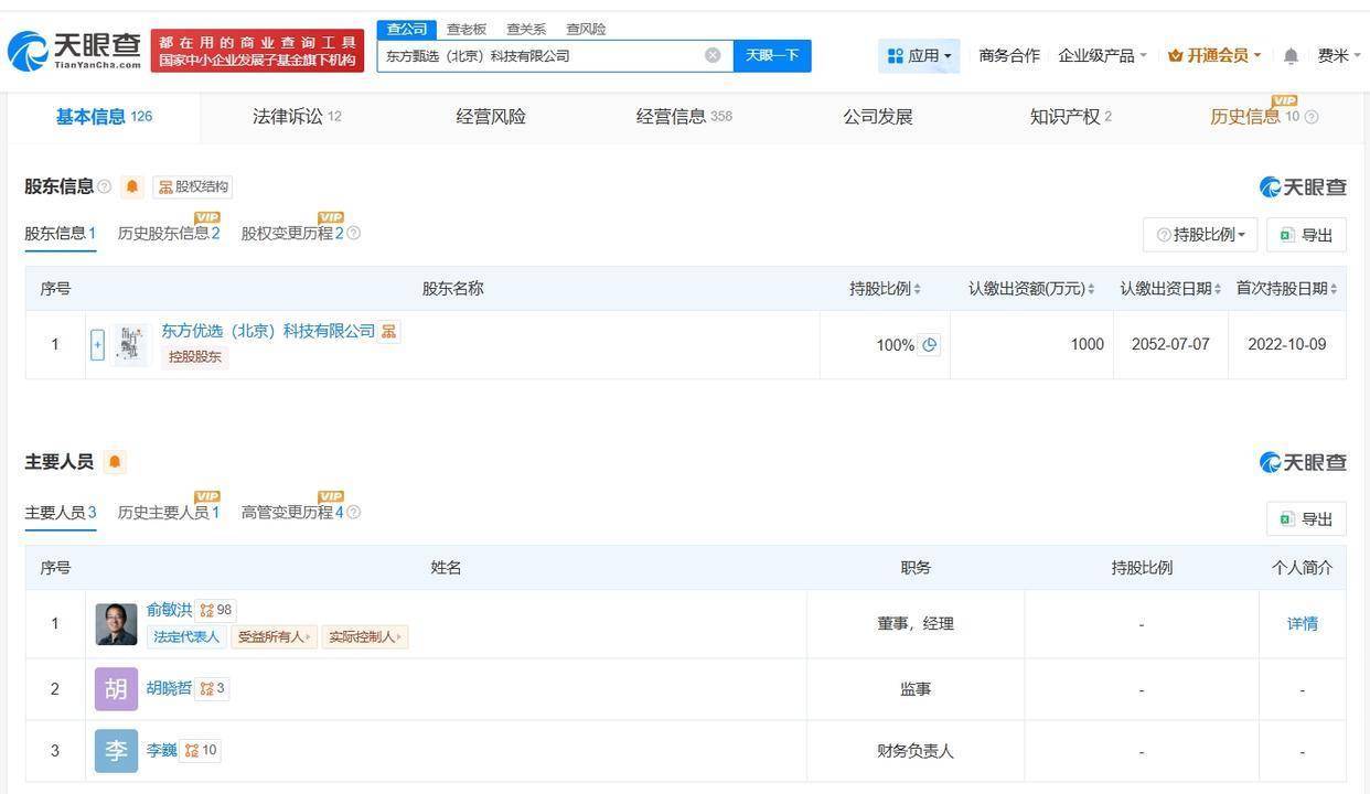 东方甄选(北京)科技有限公司成立于2021年12月,注册资本1000万人民币,经营范围包括企业形象策划、会议及展览服务、食用农产品批发等。股东信息显示,该公司由东方优选(北京)科技有限公司全资持股。据媒体报道,11月6日,俞敏洪在社交媒体平台上确认,东方甄选前CEO孙东旭离职。俞敏洪表示,近期孙东旭因为个人原因,提出不再继续工作。俞敏洪同时称,其两人之间保持着很好的沟通,没有任何龃龉和隔阂。