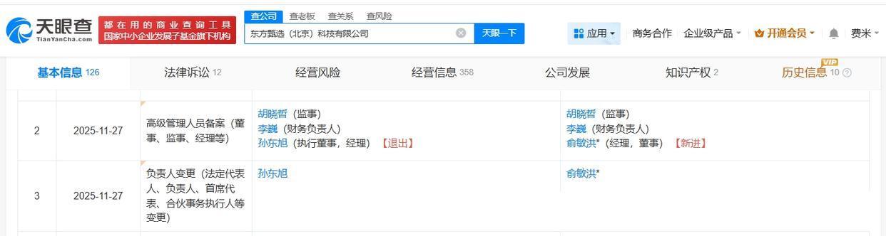 天眼查工商信息显示,近日,东方甄选(北京)科技有限公司发生工商变更,孙东旭卸任法定代表人、执行董事、经理,俞敏洪接任法定代表人、经理策略池,并担任董事。同时,该公司经营范围新增餐饮管理、外卖递送服务、餐饮服务等。
